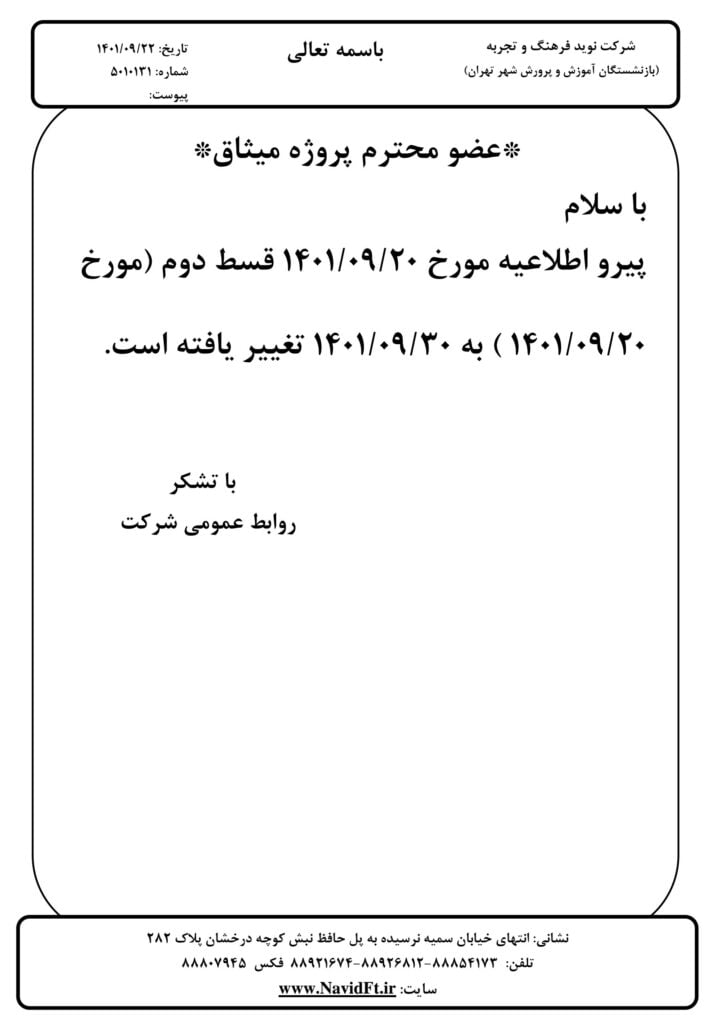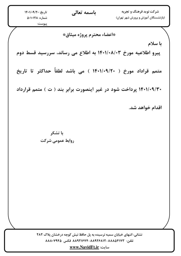 با توجه به كاهش شديد دما و سرماي هوا و تعطيلي كليه ادارات و سازمان ها از طرف استانداري تهران فردا شنبه مورخ ١٤٠١/١٠/٢٤ شركت نويد فرهنگ و تجربه تعطيل