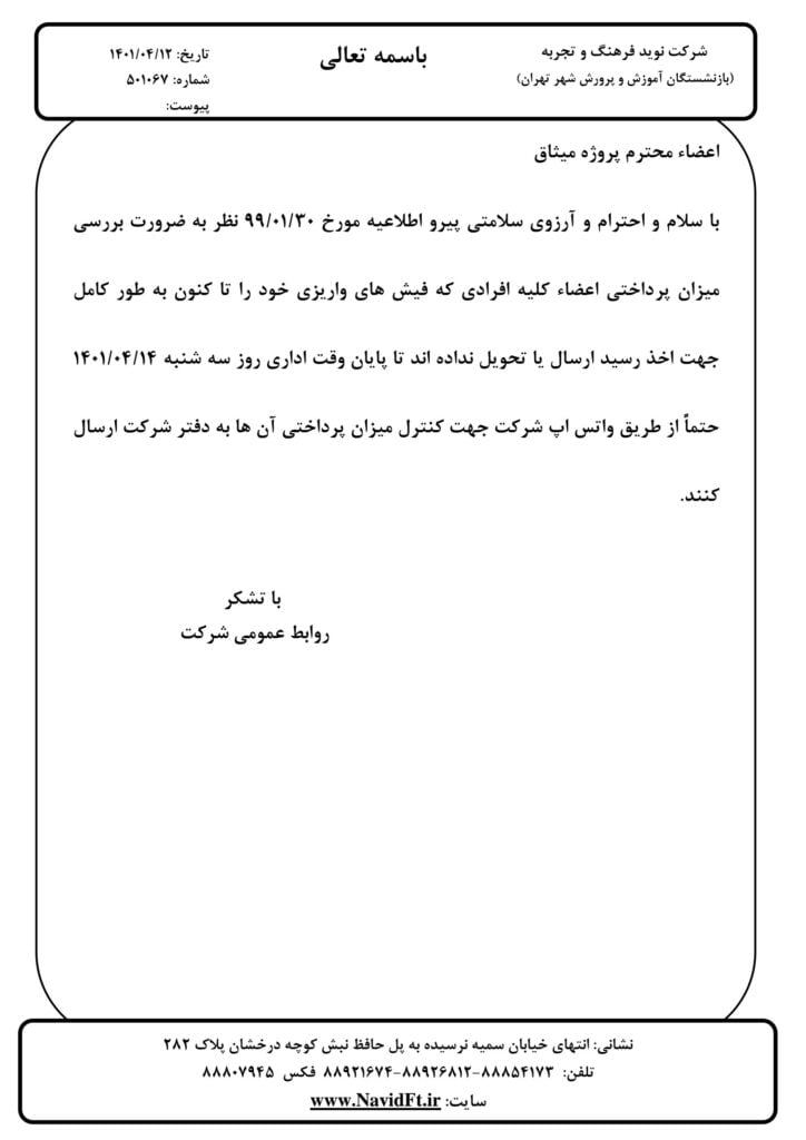 اطلاعیه مهم شرکت نوید فرهنگ و تجربه
